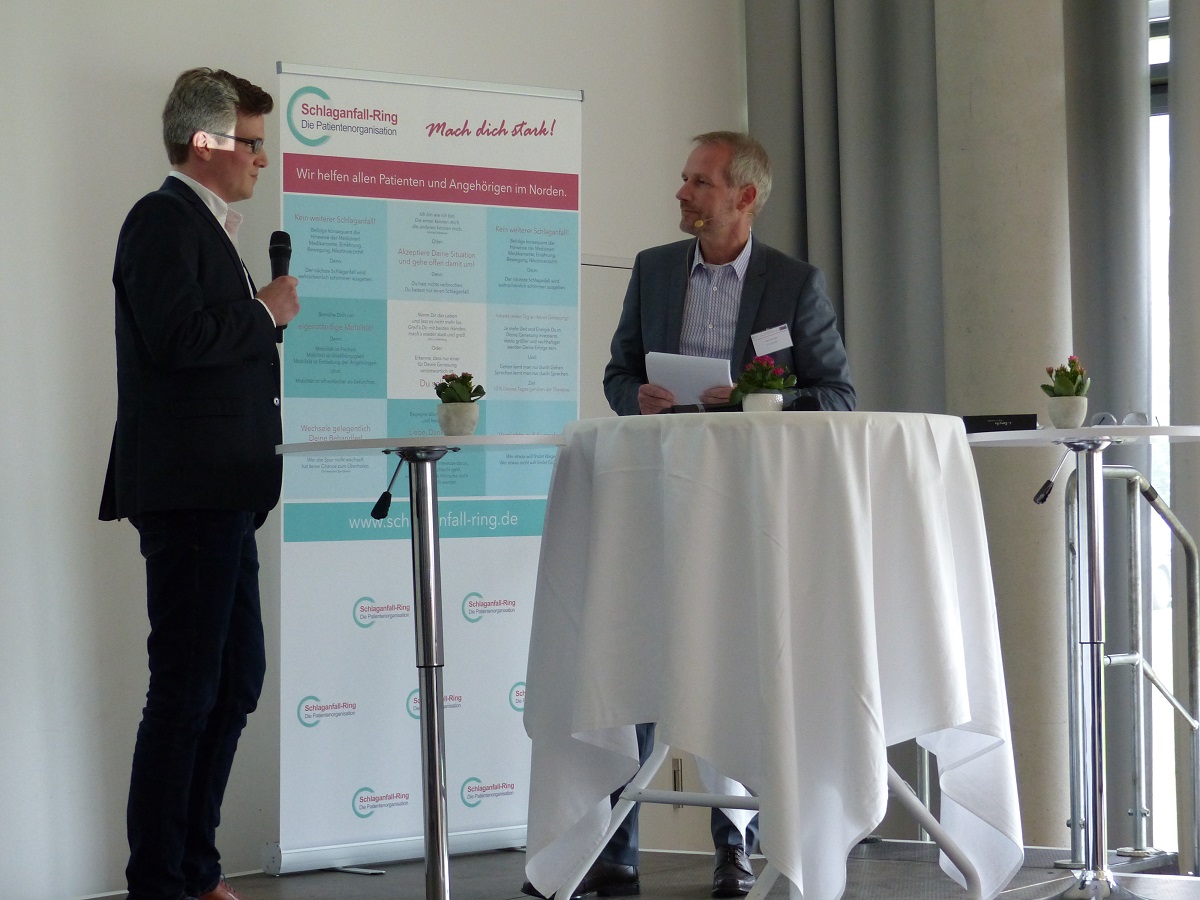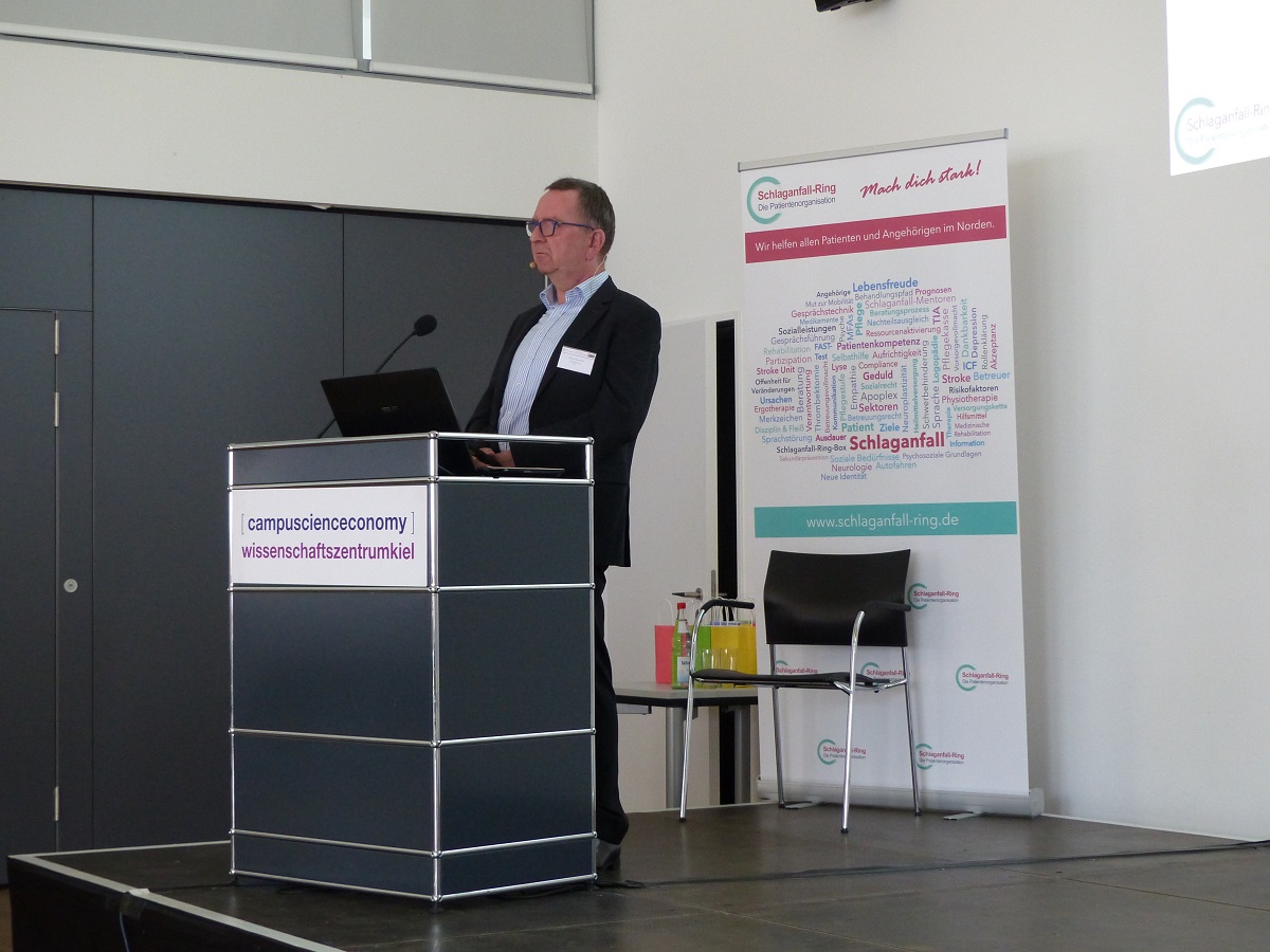 Etwa 70 Teilnehmer fanden sich am 27.09. im Wissenschaftszentrum Kiel ein, um zu erfahren, wohin der Weg, dessen erste Schritte in den letztjährigen Veranstaltungen gegangen wurden, inzwischen geführt hat. Jürgen Langemeyer, Vorsitzender des Schlaganfall-Ring, berichtete nach der Begrüßung der Teilnehmer über den momentanen Stand der Vereinsarbeit und verortete in einem Marathon-Gleichnis unsere derzeitige Position bei Kilometer dreieinhalb – trotz aller Fortschritte gibt es also noch viel zu tun.