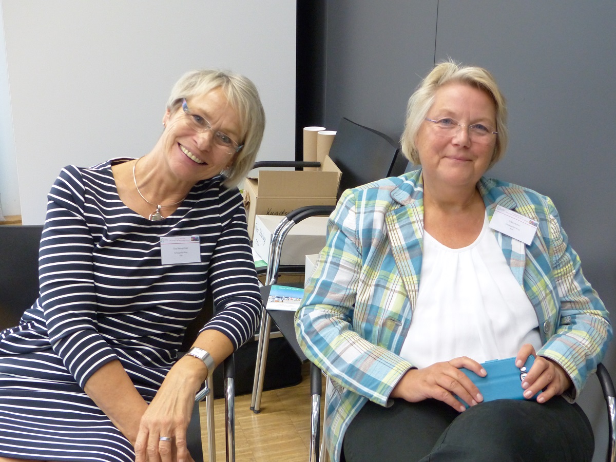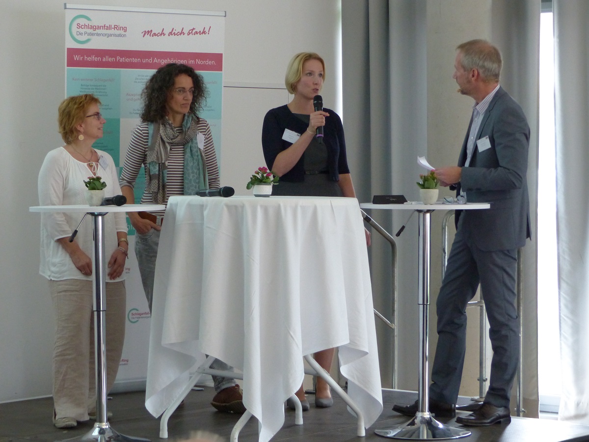 Anschließend wurde es Zeit, einmal einen Blick auf die derzeit laufenden Projekte zu werfen. Seit September 2016 läuft in Bad Segeberg die Ausbildung zum Schlaganfall-Helfer und Schlaganfall-Mentor, in der betroffene Patienten und Angehörige gemeinsam mit Profis aus unterschiedlichen medizinischen Bereichen geschult werden. Ziel ist es, dass die Helfer und Mentoren Schlaganfall-Betroffene beraten und in der chaotischen Zeit nach der Erkrankung unterstützen. Schlaganfall-Helferin Dorothee Krause aus Lübeck und die ehrenamtliche Schlaganfall-Mentorin Hanna Röske-Blasey aus Mölln berichteten, wie sie die Schulung erlebt haben und wie die Perspektive der „anderen Seite“ die Qualität der Schulung ausmacht.