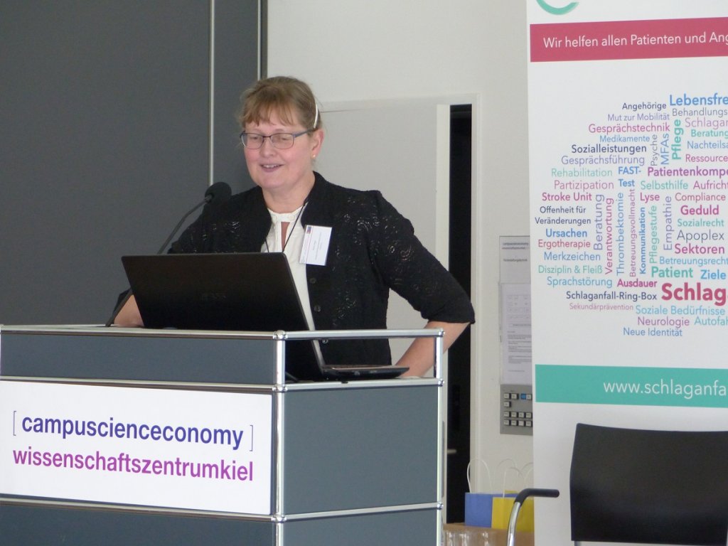 Wie diese Schlaganfall-Nachsorge weiter verbessert werden kann, erläuterte Prof. Dr. med. Hanna Kaduszkiewicz vom Institut für Allgemeinmedizin aus Kiel. Dieses startete nämlich gemeinsam mit dem Schlaganfall-Ring ein Versorgungsprojekt, das in den Regionen die Akteure der Schlaganfall-Versorgung zusammenbringt, um einerseits die Kommunikation der Disziplinen untereinander zu verbessern und andererseits Lösungen für bestehende Versorgungsprobleme zu entwickeln. Die erste Initiative startete im Raum Rendsburg, wo seit einigen Monaten intensiv an praxisnahen Verbesserungsstrategien gearbeitet wird. Frau Turowski vom motion-center Holger Otto aus Rendsburg, die federführend in der Region aktiv ist, berichtete von den Ideen der Arbeitsgruppe und wie vor allem Patienten davon profitieren.