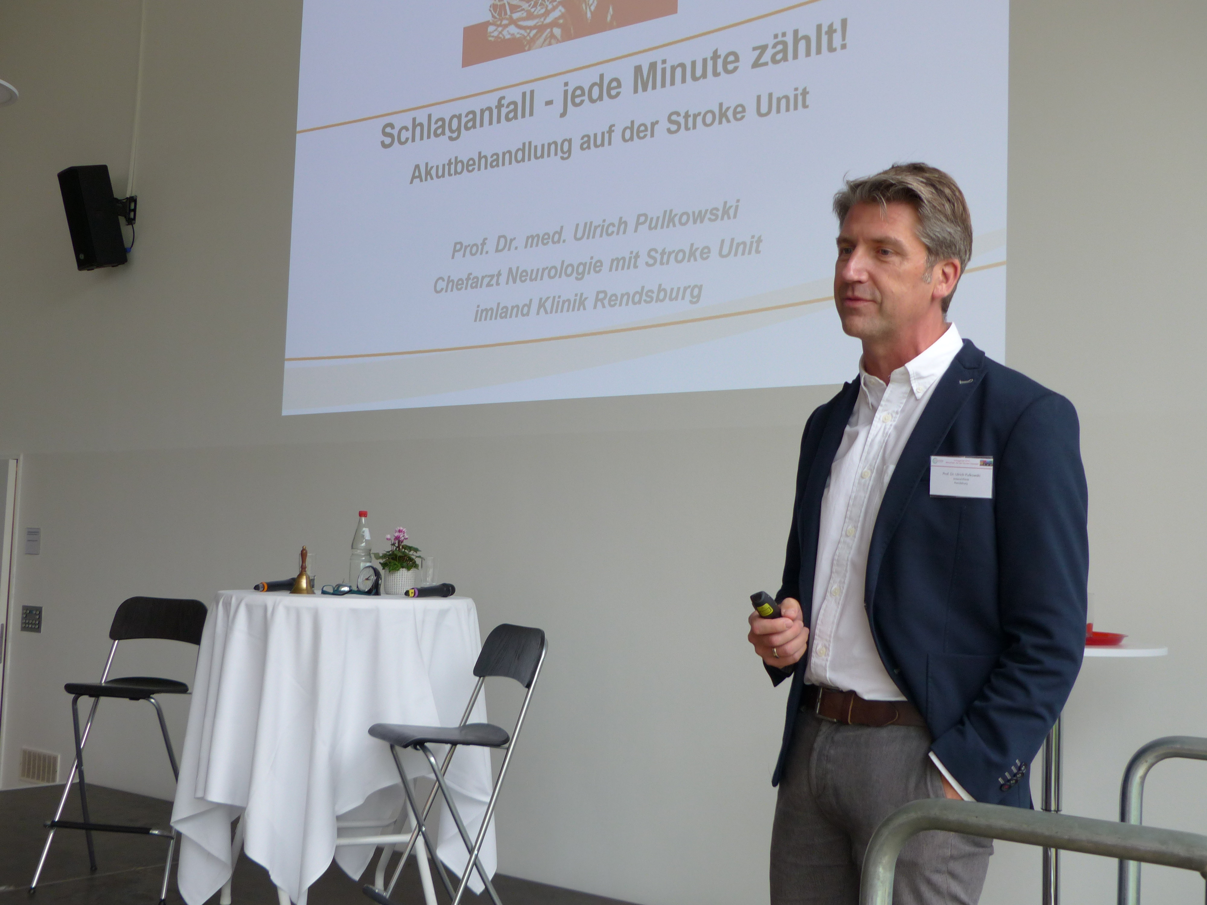Prof. Dr. Ulrich Pulkowski, Chefarzt der Neurologie der imland Klinik in Rendsburg, erklärte den Gästen auf sehr kurzweilige Weise, was in der Klinik passiert, wenn es zu einem Schlaganfall gekommen ist und welche neuartigen Therapiemöglichkeiten inzwischen zur Verfügung stehen. Er machte aber auch klar, dass es an den Patienten ist, ihren Teil dazu beizutragen, nämlich die Symptome ernst zu nehmen und rechtzeitig die 112 zu wählen. Ist der Patient nach Hause zurückgekehrt, benötigt er oft jahrelange ambulante Therapien. Die Situation der Heilmittelerbringer bietet in vielerlei Hinsicht Optimierungsbedarf. Ob die Initiierung einer Therapeutenkammer eine mögliche Lösung wäre, darüber sprach Physiotherapeutin Swanhild Priestley.